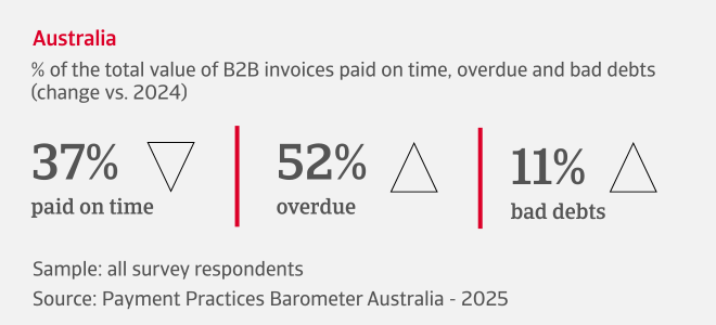 The uncertain impact of the US protectionist policies on global trade is expected to pressure economic activity in Australia, complicating business and financial planning. As a result, many companies are hesitant to make firm predictions about future trends in B2B customer payment behaviour. This because highly volatile market conditions may significantly increase financial instability and the risk of late payments and defaults.