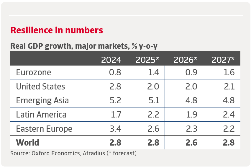 • Growth is set to moderate slightly in 2026, weighed down by advanced economies in particular. Emerging markets are more resilient but are still struggling with trade policy volatility and global financial uncertainty