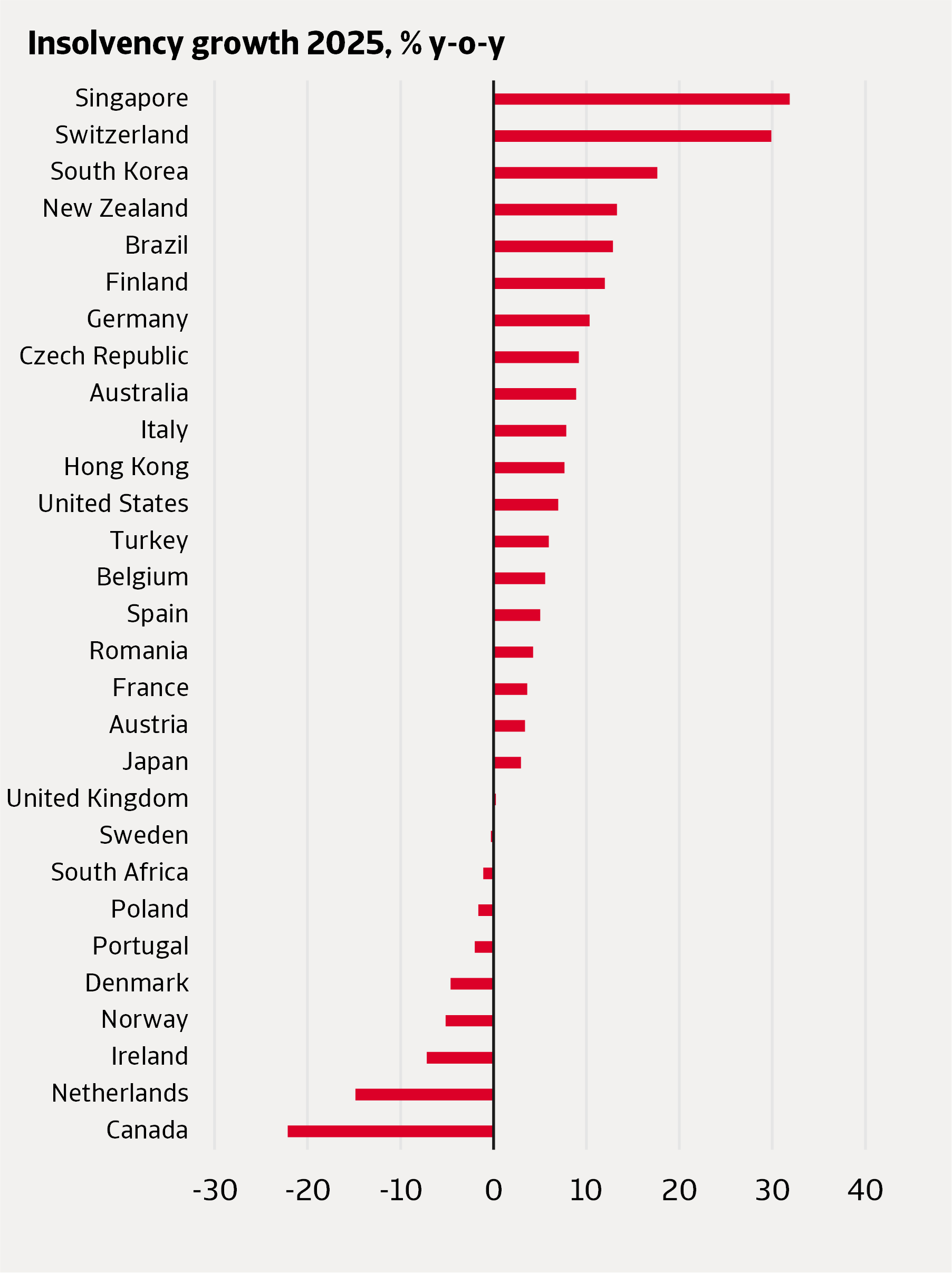 Globally, our expectation is that insolvencies will grow moderately by 3% in 2026, with signs of normalisation to lower levels generally starting in the second half of 2026. This is a 6 percentage points upward revision compared to our October 2025 Insolvency Outlook, when we expected that insolvencies will start normalising from early 2026.