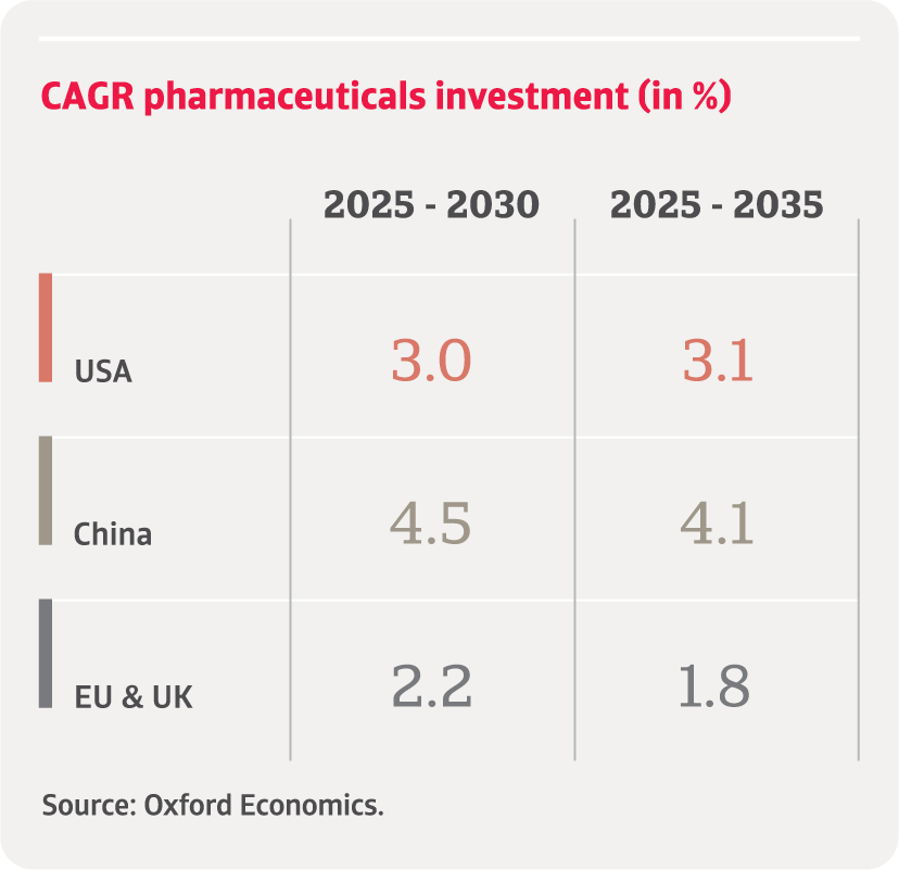 European businesses, in particular, face competitive disadvantages as more pharma businesses invest in the US and China, at the expense of investments in Europe over the coming years. Despite well-established manufacturing facilities, secure supply chains and high production standards, the EU is facing gradually decreasing competitiveness in innovation. This is due to slower clinical trial setup times, weakening its ability to develop and produce new drugs early, in addition to less favourable regulatory and funding environments, and smaller patient pools compared to the US and China.