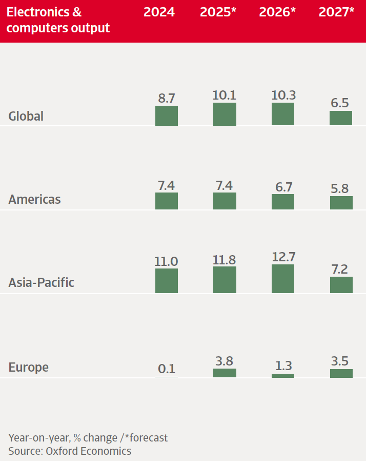 The weak investment outlook in the EU and the UK continues to weigh on capital-reliant precision equipment and optical instruments production, which is the largest electronics subsector in the region. Production is forecast to slow to 0.8% this year from 2.4% in 2025. Growth will likely pick up as of 2027 when the recovery will be on a firmer footing.