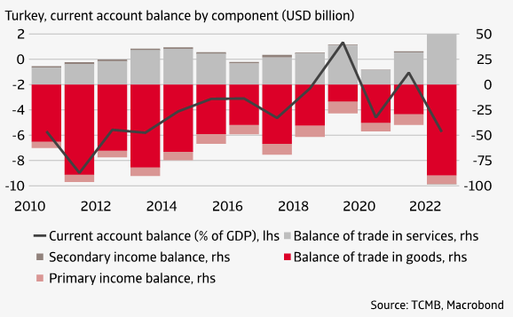 Another vulnerability of Turkey’s economy is its weak external position, characterised by structural current account deficits and high external debt. The current account deficit widened to 5.7% of GDP in 2022 (figure), and we forecast that it remains wide in 2023 at 4.5%. The main factor driving the wide current account deficit is the rising import bill, specifically of energy imports. As energy and raw materials are denominated in USD, the weakness of the lira only has a limited positive effect on the current account. We forecast the current account deficit to narrow in 2023-2024 as slowing economic growth curbs the rise in imports, while lira depreciation boosts exports.