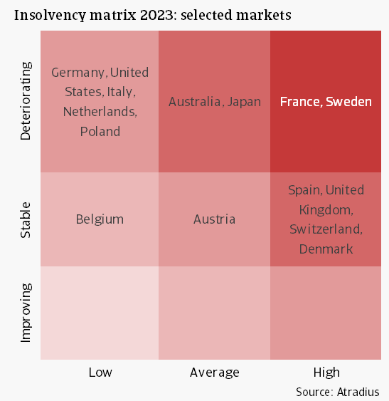 There are several countries with a stable insolvency situation, i.e. countries that see an insolvency change between -10% and +10% in 2023. These include Belgium, Austria, Spain, the United Kingdom, Switzerland and Denmark. Among these countries, the UK is an interesting market, as the insolvency level is relatively high: 140% of the pre-pandemic level. The majority of countries, however, see a tendency for bankruptcies to deteriorate in 2023, even though the level compared to pre-pandemic often remains ‘low’. France and Sweden are two examples of countries in a more worrisome position, as the situation in 2023 is ‘deteriorating’, while the insolvency level in 2023 is also considered ‘high’.