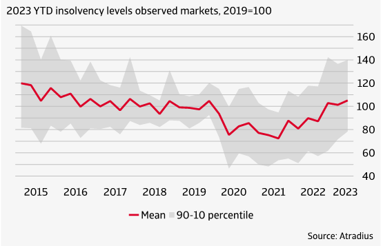The global number of insolvencies increased by 9% in 2022 as the pandemic support packages and temporary changes to insolvency legalisation were lifted. Chart 1 gives the year-to-date insolvencies index in 2023 relative to 2019. A value above 100 indicates that the insolvency level is above the (pre-pandemic) 2019 level. A value below 100 means the insolvency level is still lower than in 2019.