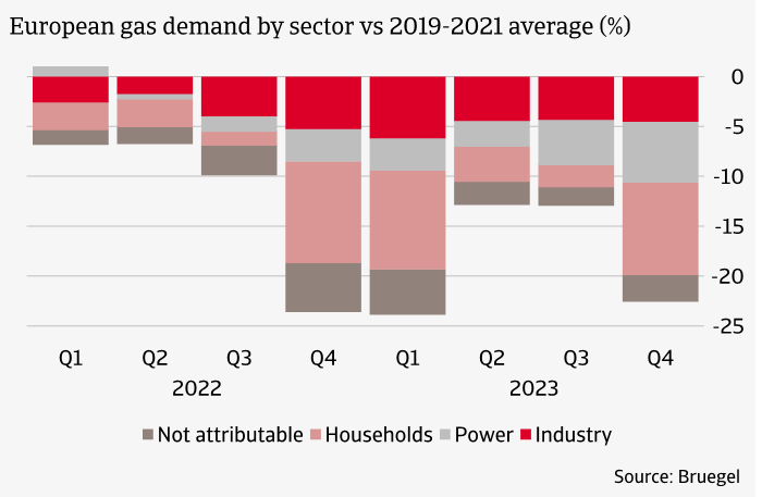 Another response to the gas crisis was on the demand side. Total EU gas demand was around 20% lower in 2023 compared to pre-crisis (average of 2019-2021). The contribution to the total gas demand reduction was highest for households, followed by industry and the power sector.