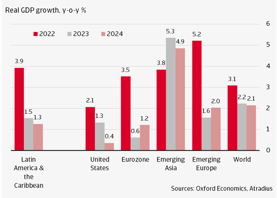 Meanwhile, the region's outlook has worsened. We forecast GDP growth to slow to 1.5% in 2023 and to remain sluggish at 1.3% in 2024, lagging other emerging market regions. This slowdown mirrors the deterioration in the external environment, especially in key trade partners, the US and China. Skyrocketing inflation in the US and the Federal Reserve’s monetary tightening response both pose headwinds to global economic activity. Although China's economy is recovering after the late lifting of that country’s zero-Covid policy, its industrial production remains meagre and as such the demand for commodities. Lower demand for goods as well as travel from advanced economies and less production in China will keep Latin America’s economic growth below its pre-pandemic annual average of 2.5% over the coming years.