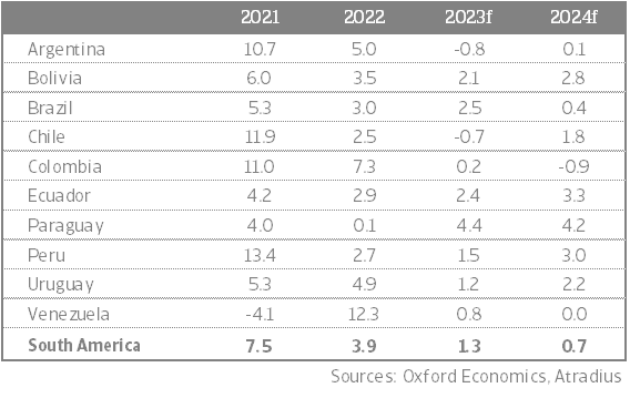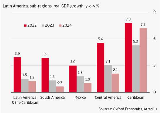 After a stronger than expected performance in 2022, we project economic growth in commodity-rich South America to fall from 3.9% in 2022 to 1.3% in 2023 and to ease further to 0.7% in 2024. This makes South America the weakest performing sub-region in Latin America. Next to a moderation of external demand and commodity prices and the lagged effects of high inflation and monetary policy tightening, country-specific factors weigh on South America's growth prospects. The region continues to deal with the effects of a wave of social unrest starting in late 2019, particularly in Bolivia, Ecuador, Chile, Colombia and Peru. Higher food and energy prices contributed to social pressures as well. This, combined with elevated policy uncertainty and governability challenges will undermine business sentiment and private investments in most of South America going forward.