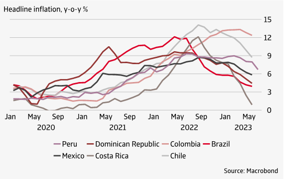 Inflation appears to have peaked in most LAC countries but it’s clear that we are not out of the woods yet (see figure 3). Inflation remains well above target in most markets – with the exception of Costa Rica – and risks remain to the upside, particularly for food prices. This will delay monetary policy easing.