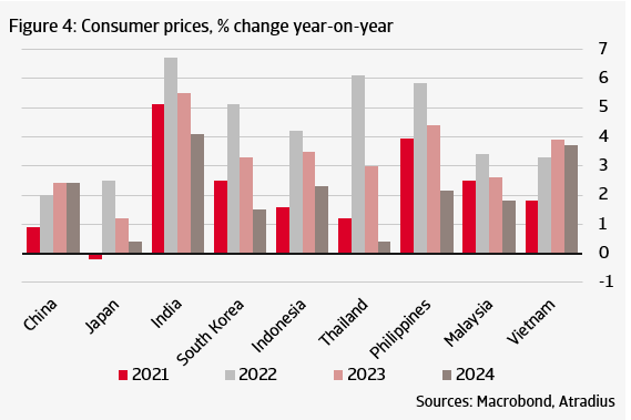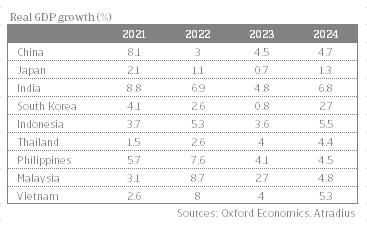 For several decades, Asia has generally been the region with the highest economic growth in the world. In line with this, most economies in the region have shown a solid recovery from the period of weak or even negative growth caused by the Covid-19 pandemic. As expected, the economic recovery continued into 2022, aided by vaccination campaigns and fiscal stimulus. However, unexpected headwinds emerged in the form of the Russian invasion of Ukraine and increased geopolitical tensions in the region. Inflation, already high, rose further and central banks were forced to adopt or maintain tight monetary policy. In addition, China continued to adhere to the strict zero-Covid policy for a long time, as a result of which the growth of this important economy lagged behind expectations.