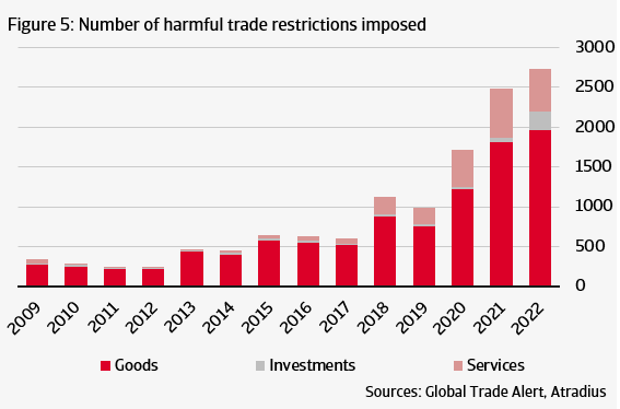 There is as yet no question of a far-reaching decoupling of economies, if only because decades of globalisation and thus increasing connectivity between economies cannot easily, let alone quickly, be reversed. Early signs of trade fragmentation pressures, however, are clearly visible in data on trade-related uncertainty, which spiked in 2018 amid US-China trade tensions. From early 2022, the Russian invasion of Ukraine and related sanctions on Russia have increased the uncertainty around future trade relations.