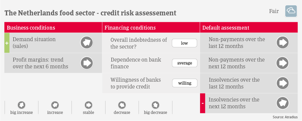 Banks are generally willing to provide loans to the industry, while the indebtedness of Dutch food & beverages companies is low, compared to their EU peers. Payments in the industry take 45 days on average, and payment behaviour has been good over the past two years.