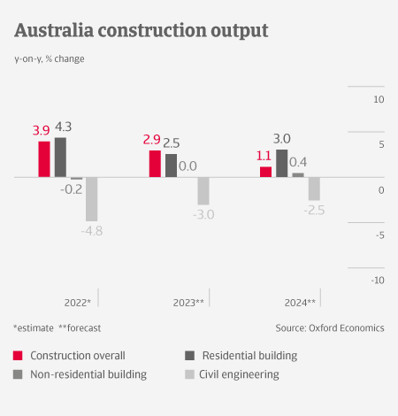In 2023, Australian construction output is expected to slow somewhat, to about 3%. Residential building is impacted by elevated inflation and increasing interest rates, which have led to a deterioration of property prices, while construction costs have surged.