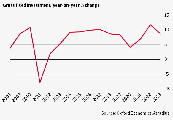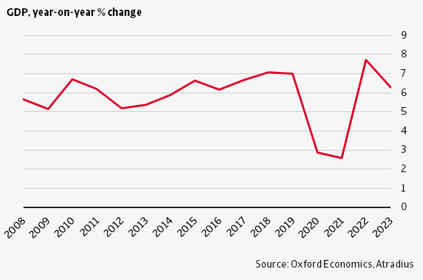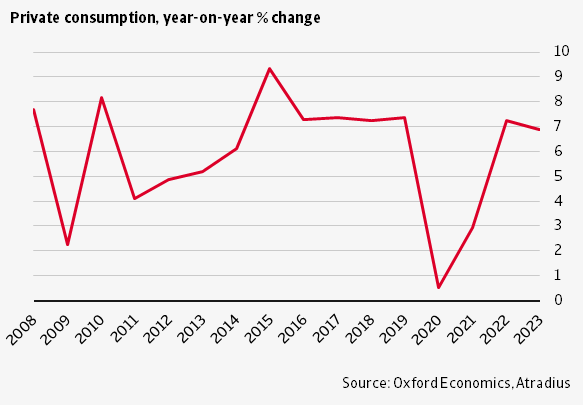 However, we expect more headwinds in H2 of 2022 and into 2023, due to weaker external demand, in particular from the Eurozone and the US. An additional downside risk is the ongoing economic slowdown in China, another main export destination. This will impact manufacturing and export performance, while at the same time global financial conditions have tightened. Therefore, we expect GDP expansion to slow somewhat in 2023, to 6.3%. Export and manufacturing growth should decelerate to 7.7% and 1.2% respectively. However, we expect that private and government consumption remain robust, growing 7% and 6% respectively.